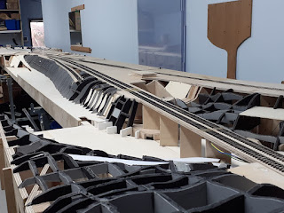 A few members of the group managed to get together on Saturday at Roy's shed. Although meetings have been restricted due to the ongoing pandemic, Roy has been busy on the layout. The following photographs show the progress Roy has made on building the formers for the scenics. The base for the terrain is built up using foam board.